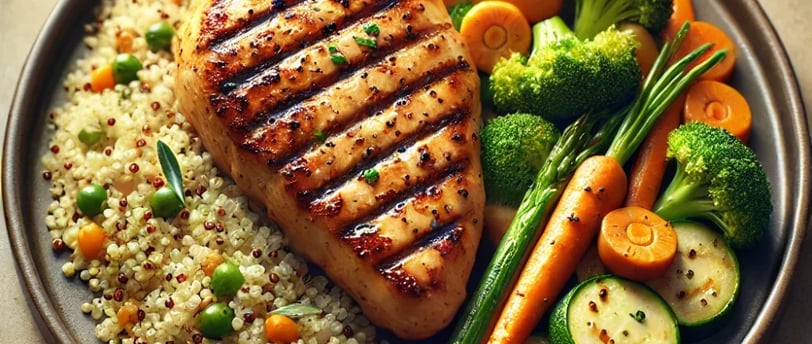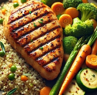 Frango Grelhado com Quinoa e Legumes Assados, apenas 439,5 kcal